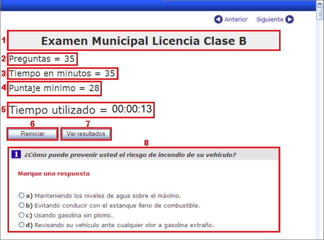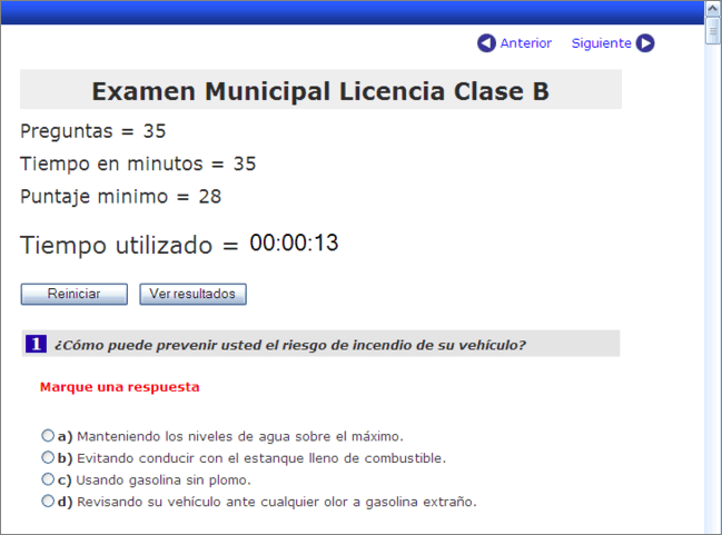 La página principal del Test presenta algunas de las preguntas que aparecer´án en el test real, y también información sobre el test, porcentaje o puntaje de aprobación, tiempo en minutos, etc.