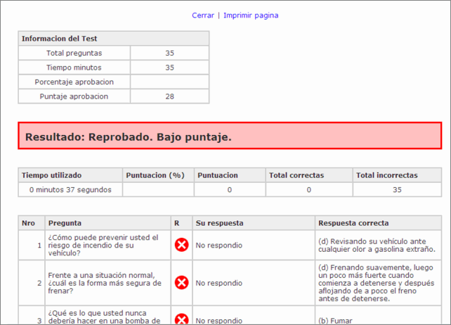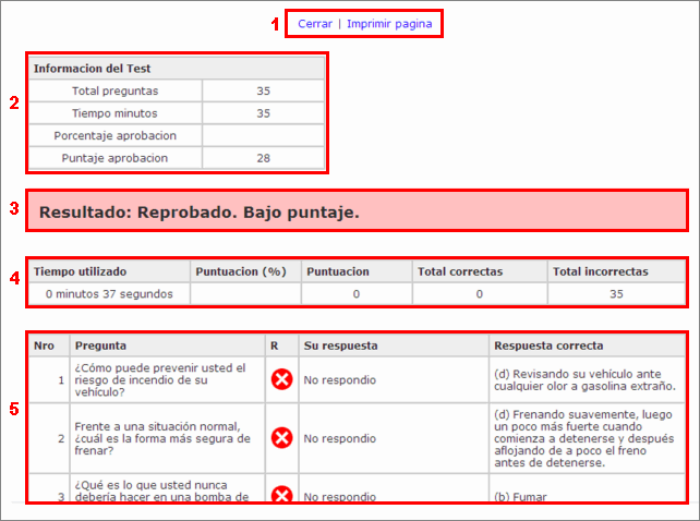 1.- Barra de navegacion superior: haciendo clic en Cerrar cierra la ventana de resultados, o clic en Imprimir página para imprimir los resultados del test.